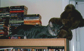 the air and landed on top of one of my book cases, where a teddy bear